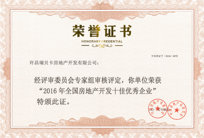 另據中國房地產業研究會3月23日通知,依據相關評選辦法與評分標準,經該研究會審委會專家組織審定,許昌瑞貝卡房地產開發有限公司獲“2016年全國房地產開發十佳優秀企業”榮譽稱號。更是對瑞貝卡地產勤奮耕耘,豐碩成果的肯定。種種的榮譽不僅印證了瑞貝卡地產以讓“生活回歸自然”的企業宗旨,也讓瑞貝卡地產在堅持“品質篤行”的道路上走的更加穩健。