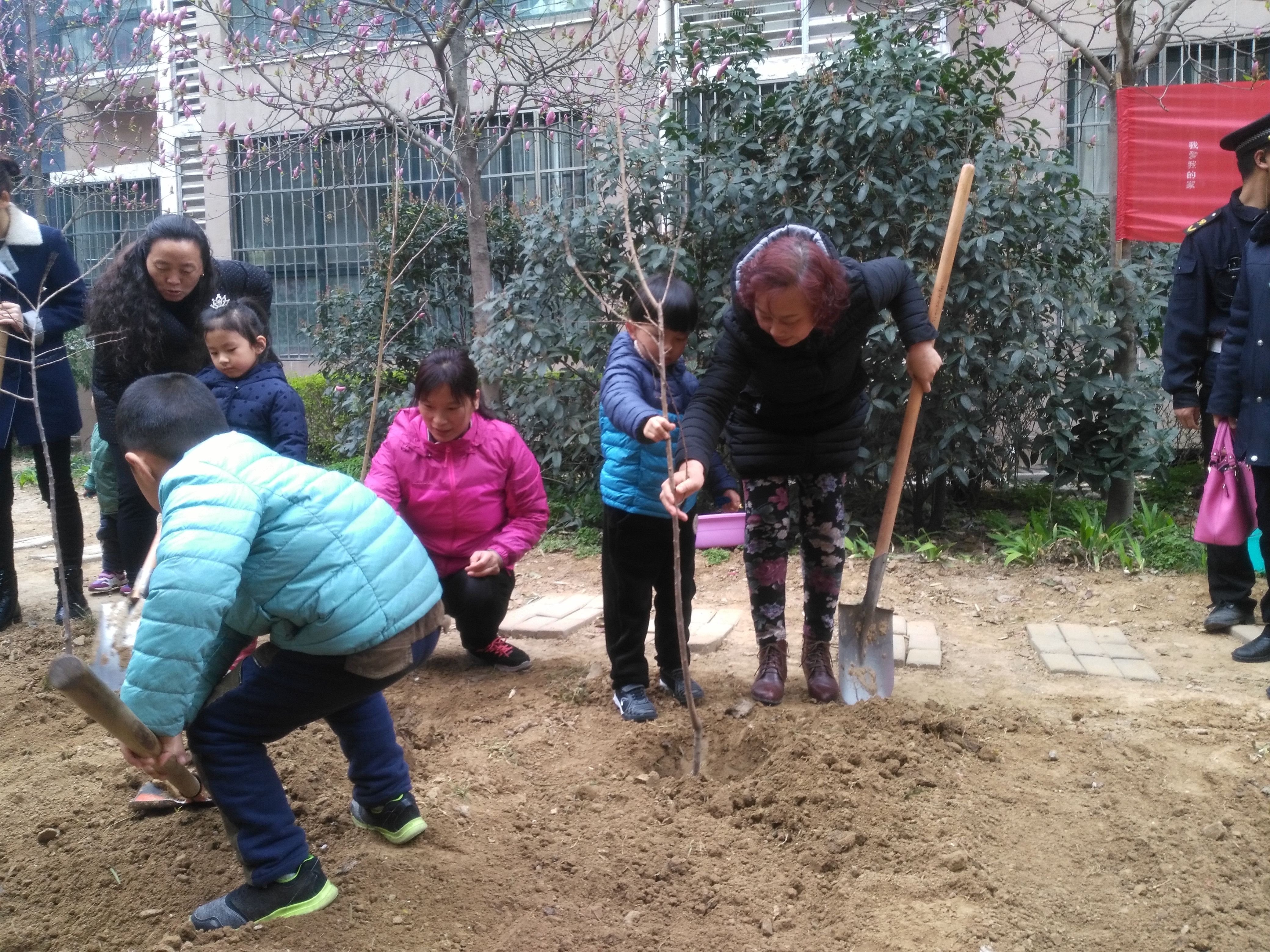 19日上午九點左右,業主們便領著孩子們紛紛來到了活動現場,不難看出連平時周末愛睡懶覺的孩子們,都因為要親手種樹便興奮地早早起了床。九點半,活動在物業公司王總及中原銀行魏文路支行郭行長的剪彩中拉開序幕。物業員工有序地為參加活動的家庭分發樹苗和鐵鍬,指引業主到指定位置進行植樹活動,并用手機為業主們記錄著這有意義的畫面。小朋友們個個爆發著小宇宙,使出渾身力氣拿著鐵鍬在家人的指導下挖土刨坑,然后種下小樹,再將土坑埋好,全程都是小心翼翼的,像是種下了一顆顆希望的種子。最后為小樹苗澆水,親手掛上寫著自己為小樹苗起名字的樹牌,跟自己種的小樹合影留念。整個過程中,親子之間的相處氛圍溫馨暖暖,物業員工與業主們打成一片,大家都在用心和盡心地做著同樣一件事情。