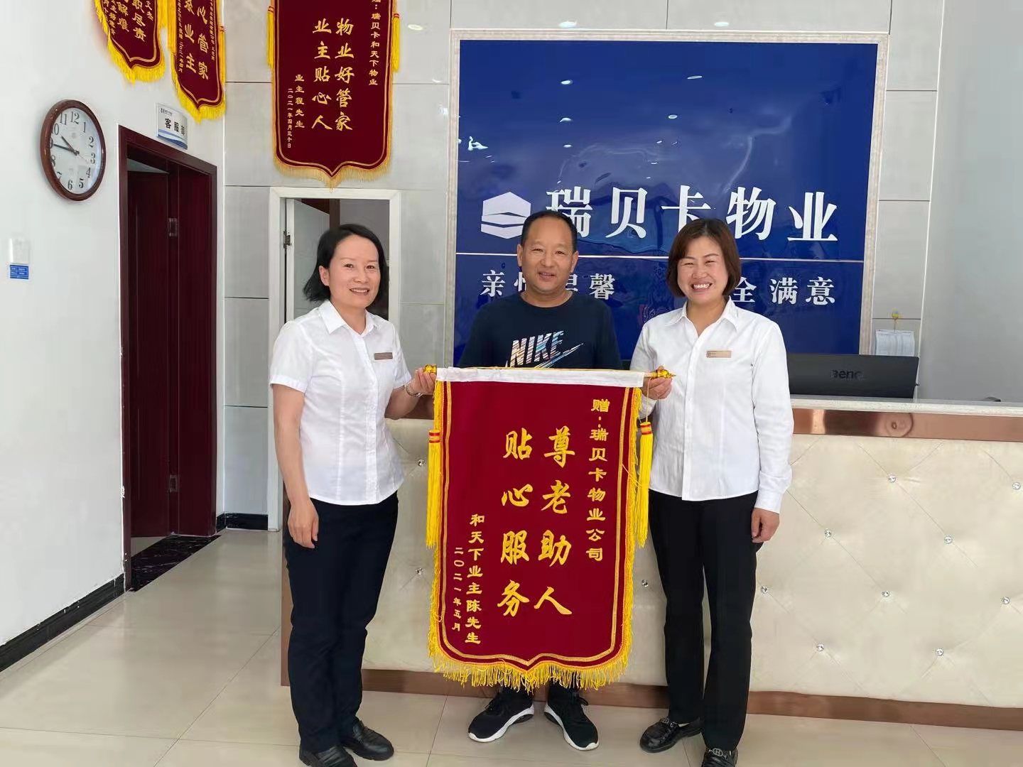 5月25日,許昌瑞貝卡和天下40號樓的陳先生給許昌瑞貝卡和天下物業服務中心送來錦旗,感謝客服主管胡金鳳在他母親散步摔倒時,伸出援手,將老人扶起后安全送回家中。