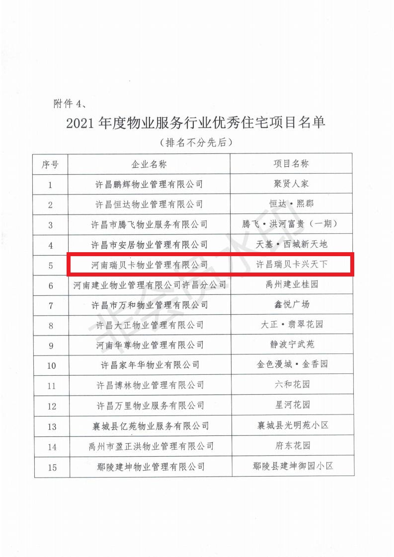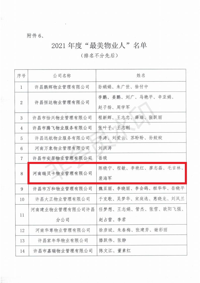 2月18日,許昌市物業管理協會發布《關于表彰2021年度許昌市物業服務行業先進企業、項目和個人的決定》,瑞貝卡物業憑借領先的綜合實力、卓越的服務及管理水平,榮獲多項殊榮。其中,物業公司榮獲2021年度物業服務行業先進企業榮譽稱號;許昌瑞貝卡興天下榮獲2021年度物業服務行業優秀住宅項目榮譽稱號;瑞貝卡物業陳曉寧、程敏、李艷紅、廖志磊、毛吉林、裴海軍榮獲2021年度“最美物業人”榮譽稱號!