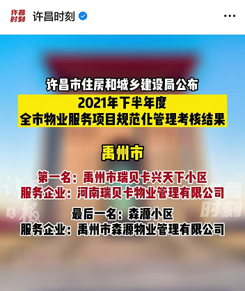 228日,許昌市2021年下半年物業服務項目規范化管理考核排名出爐,禹州瑞貝卡興天下在禹州市100個物業小區中名第一。