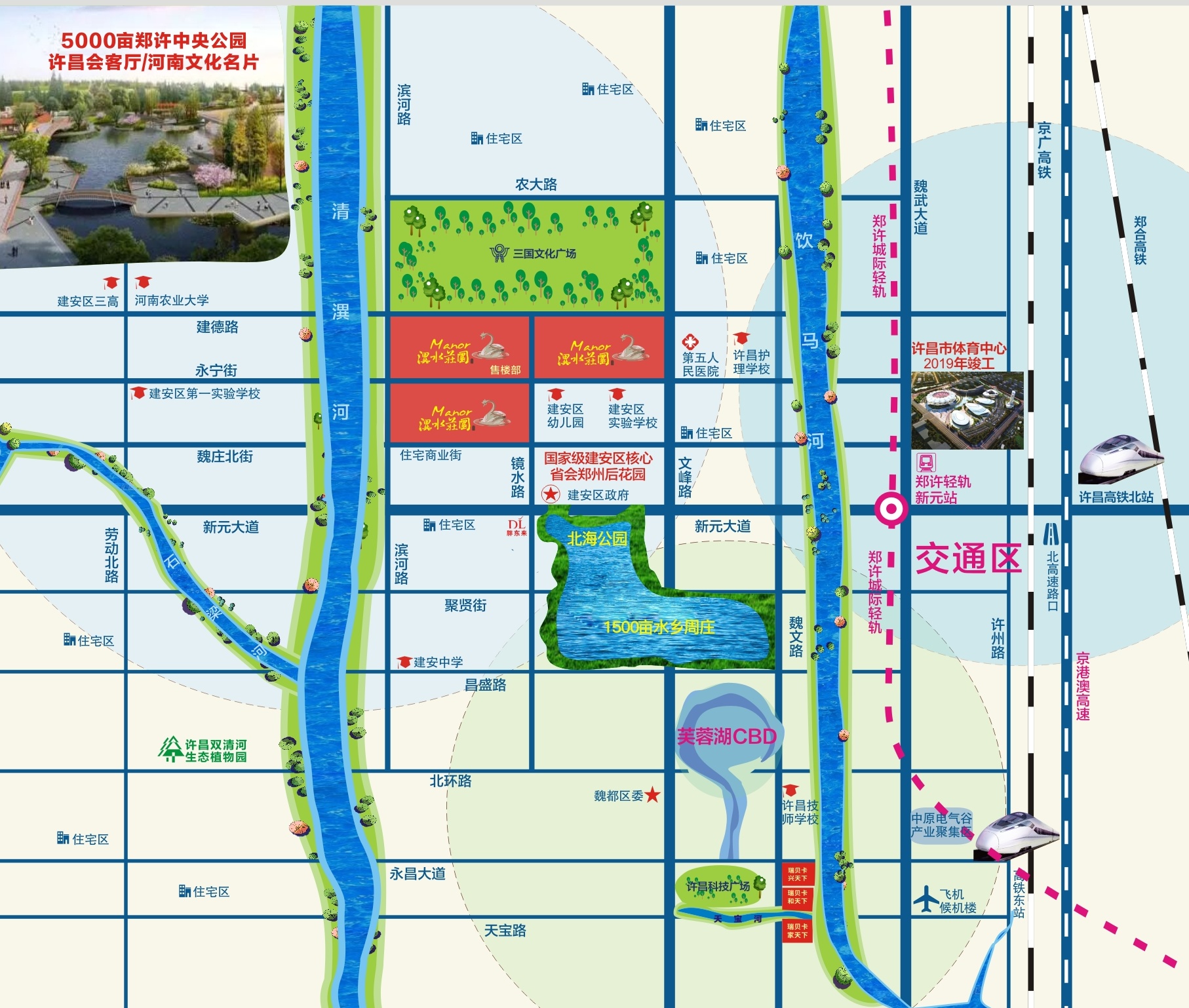項目北臨建德路、南鄰魏莊北街,東臨文峰路(107國道)、西鄰濱河大道;并毗鄰新元大道、魏武大道、勞動路等多條市區主干道。內部的永寧街和鏡水大道將項目分為3大組團。駕車由文峰路、鏡水路、濱河路、和西側勞動路15分鐘即可通達市區。從項目出發,通過文峰路10分鐘即通達長葛、2小時可以到達鄭州;而新元大道更是可迅速抵達許昌高鐵北站、京港澳高速入口等交通樞紐;而經由新元大道-魏文路或魏武大道10分鐘即可抵達高鐵東站和異地航站樓,實現您的便捷出行;未來開通鄭許輕軌之后更是半小時就可到達道鄭州。項目交通整體實現了三縱三橫、全交通工具、四通發達的立體交通網,以新元大道東部與京港澳高速處規劃為許昌高鐵北站,與魏武大道交匯處為鄭許輕軌,北高速入口,鏈接京廣高鐵、鄭合高鐵。